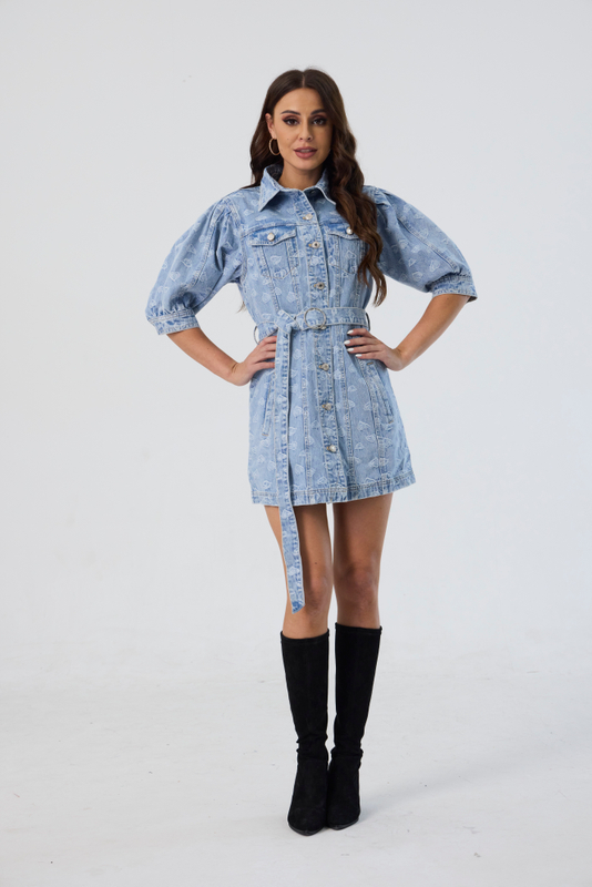 The dress features a classic shirt-style collar, front button closure, and decorative seam lines, all crafted with reinforced stitching to ensure durability during repeated wear and washing. The puff sleeves are constructed with precise volume control, giving the dress a feminine and contemporary shape without compromising comfort. The matching denim belt is made from the same high-quality fabric and allows customers to adjust the fit at the waist for a flattering, versatile silhouette. Metal buttons are selected from trusted suppliers and tested to meet industry standards for strength and color fastness.