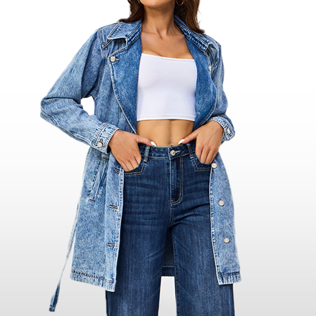 Guangzhou Spring garments factory introduces a women's long denim jacket that combines comfort with the latest fashion trends.